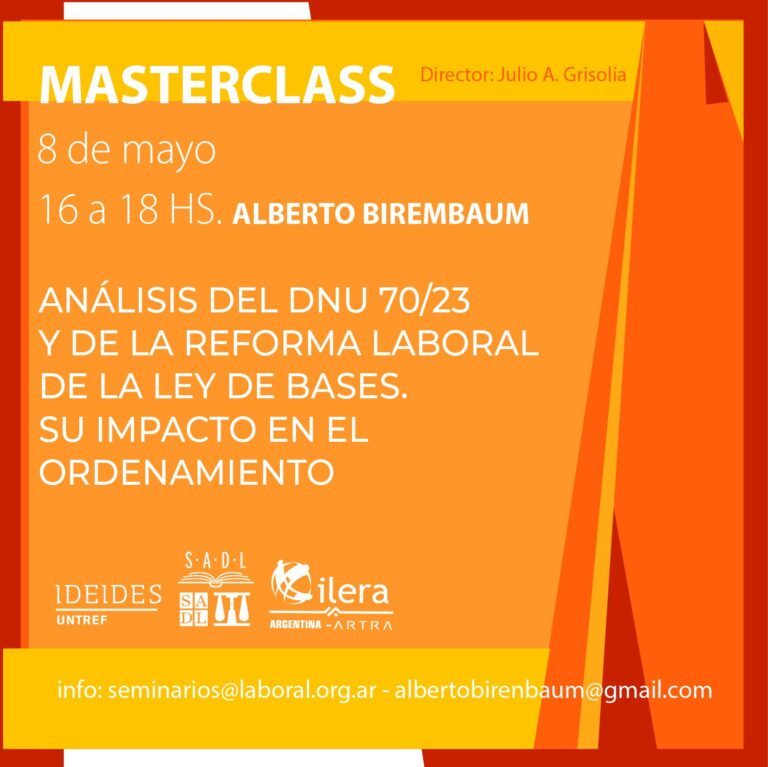 8 de MAYO. 16 a 18 hs. MASTERCLASS. ALBERTO BIRENBAUM. ANÁLISIS DEL DNU 70/2023 Y DE LA REFORMA LABORAL DE LA LEY DE BASES. INFO: seminarios@laboral.org.ar INSCRIPTOS: 25% de descuento en libros del Dr. Grisolia de Editorial Estudio