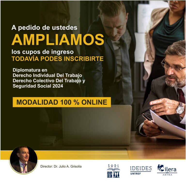 DIPLOMATURAS 100% VIRTUAL en DERECHO INDIVIDUAL DEL TRABAJO y en DERECHO COLECTIVO Y SEGURIDAD SOCIAL. Clases en vivo, grabadas y material. Director: Julio A. Grisolia. Más de 10.000 profesionales desde 2007. Articuladas con la Maestría. INFO y detalles: info@mangobra.com.ar www.mangobra.com.ar INSCRIPTOS: 25% de descuento en libros del Dr. Grisolia de Editorial Estudio